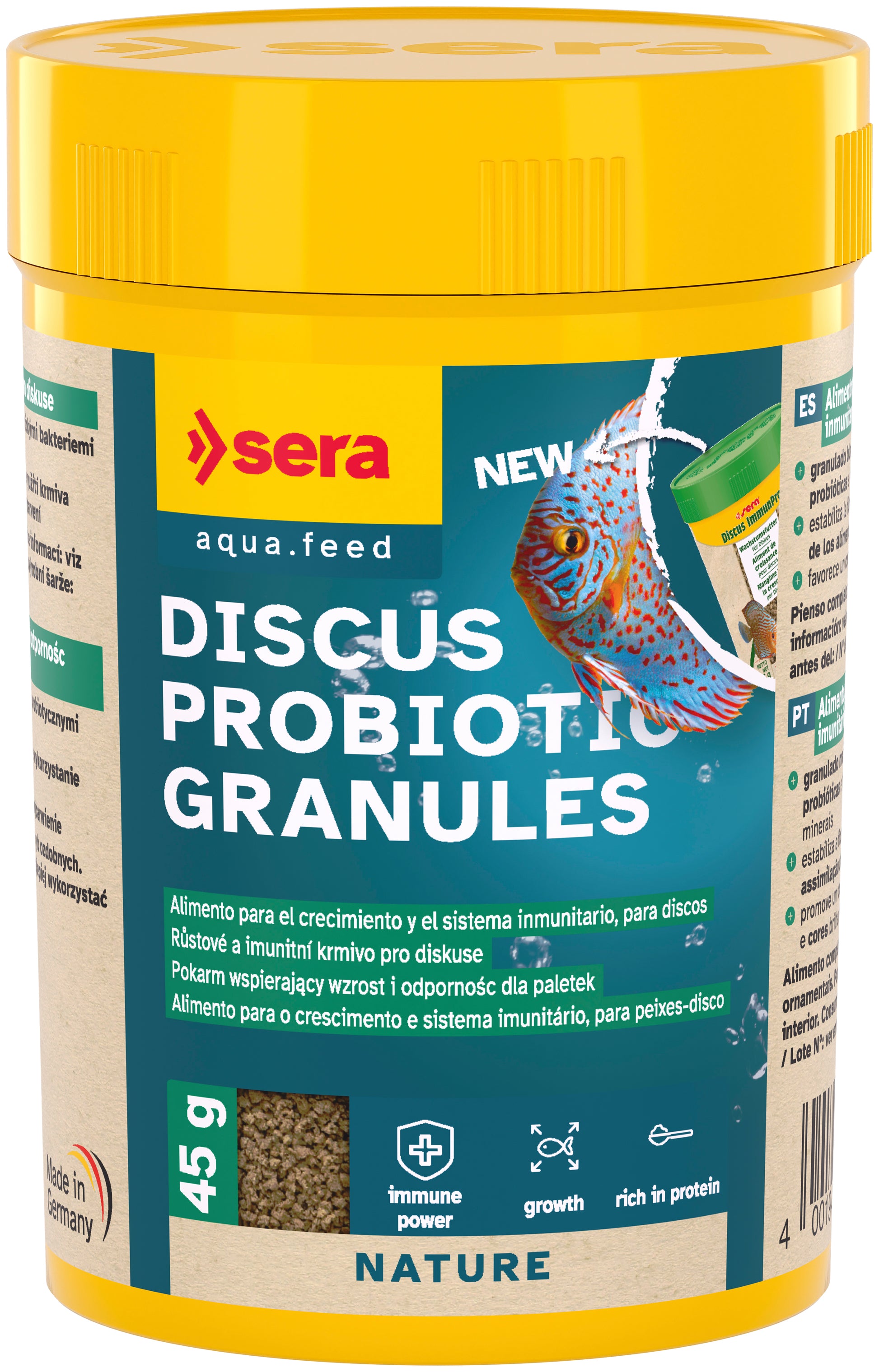 sera Discus ImmunPro Nature es un alimento de crecimiento sin colorantes ni conservantes, hecho de granulados suaves para todos los discos. Su composición equilibrada incluye krill rico en minerales, astaxantina que realza el color proveniente de la alga Haematococcus, y un probiótico, Bacillus subtilis, recomendado por la EFSA para usarse en alimentos para peces ornamentales, que apoya el crecimiento y la utilización del alimento. Esto ayuda sosteniblemente al desarrollo equilibrado y rápido de los peces, disminuyendo la contaminación del agua. Además, el estabilizador de la flora intestinal fortalece el sistema inmune